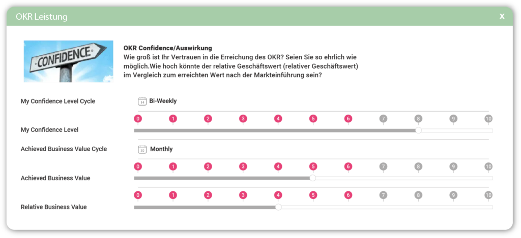 Für jedes OKR können Sie ein Zuversichts-Grad zwischen 1 und 10 wählen. Den Status Ihrer OKRs können Sie wöchentlich, alle zwei Wochen oder monatlich aktualisieren. Zudem können Sie zwischen zwei Arten von Zielen unterschieden: den verbindlichen und den angestrebten Zielen. Mit diesen Funktionen können Sie festlegen, wie optimistisch Ihr Ziel ist.